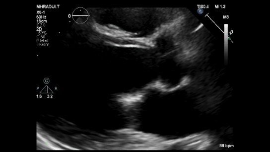An M-mode echocardiogram from the parasternal long axis demonstrates the "Hammock sign," characterized by a U-shaped abnormal systolic motion and two distinct echoes during systole, representing the anterior and posterior leaflets.